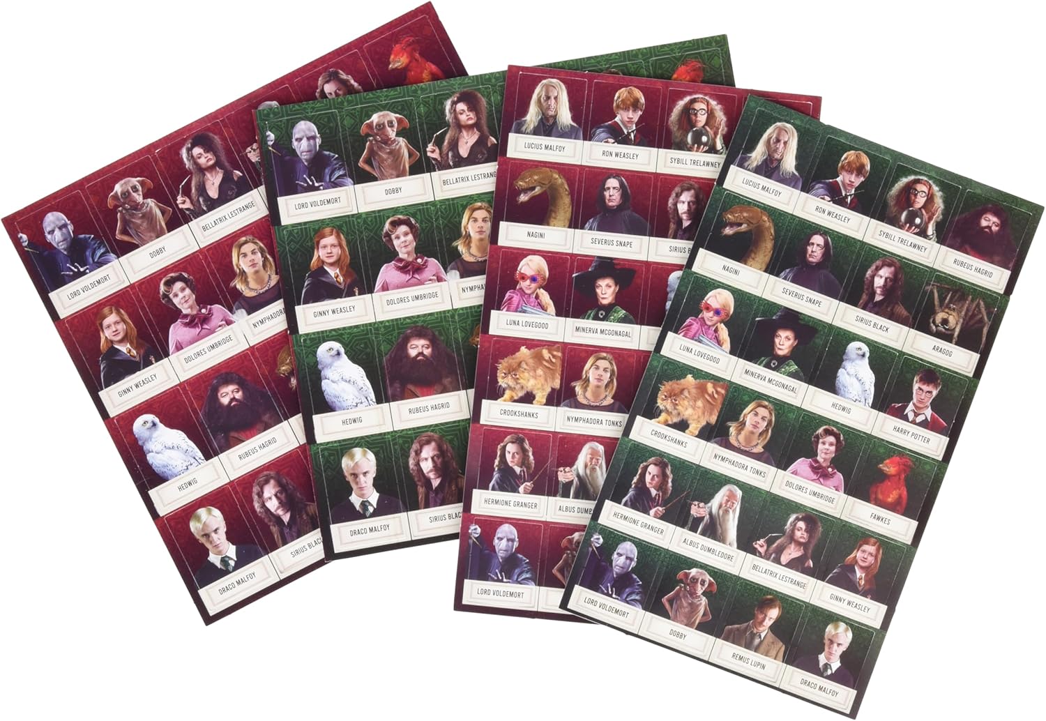 Tarjetas con personajes de Harry Potter. Tableros individuales para cada jugador donde se colocan las tarjetas de personajes. Instrucciones detalladas para jugar.